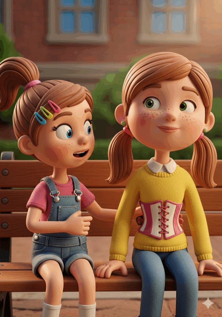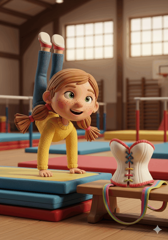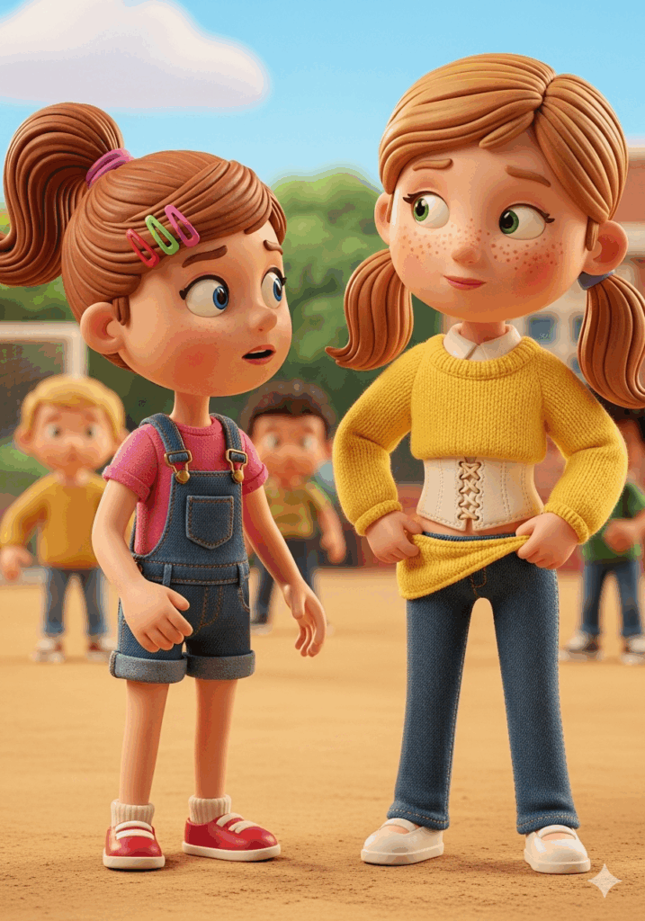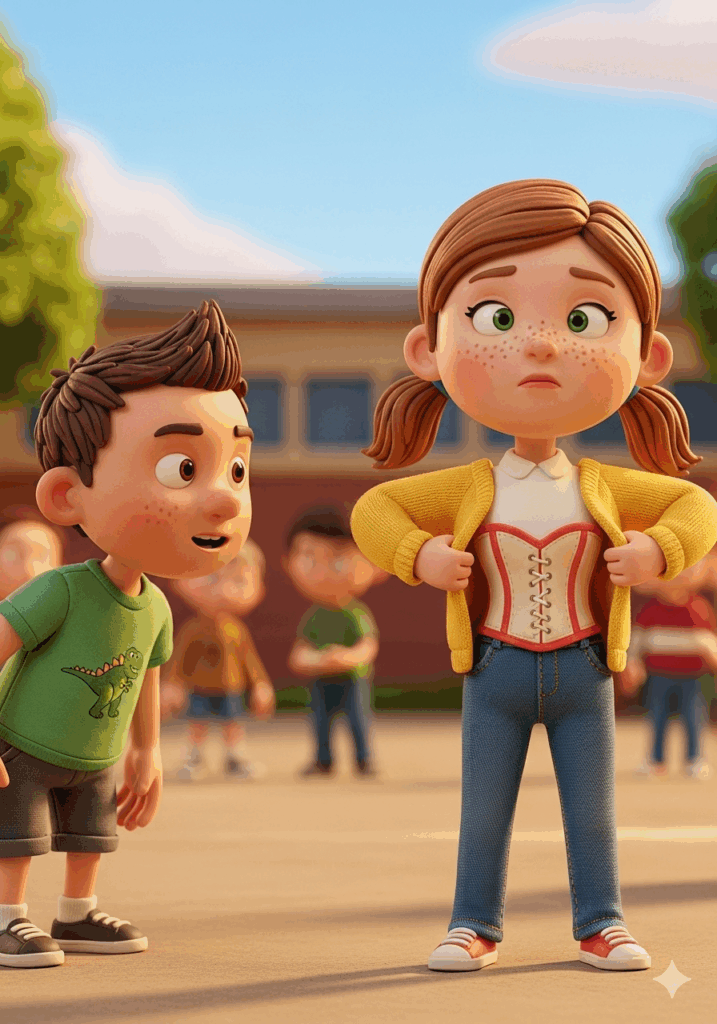 Lina zögerte nur einen Moment. Dann zog sie mutig den Pullover ein Stück hoch und sagte stolz: „Das ist mein Korsett. Mein Rücken-Panzer. Er hilft mir, stark zu werden.“