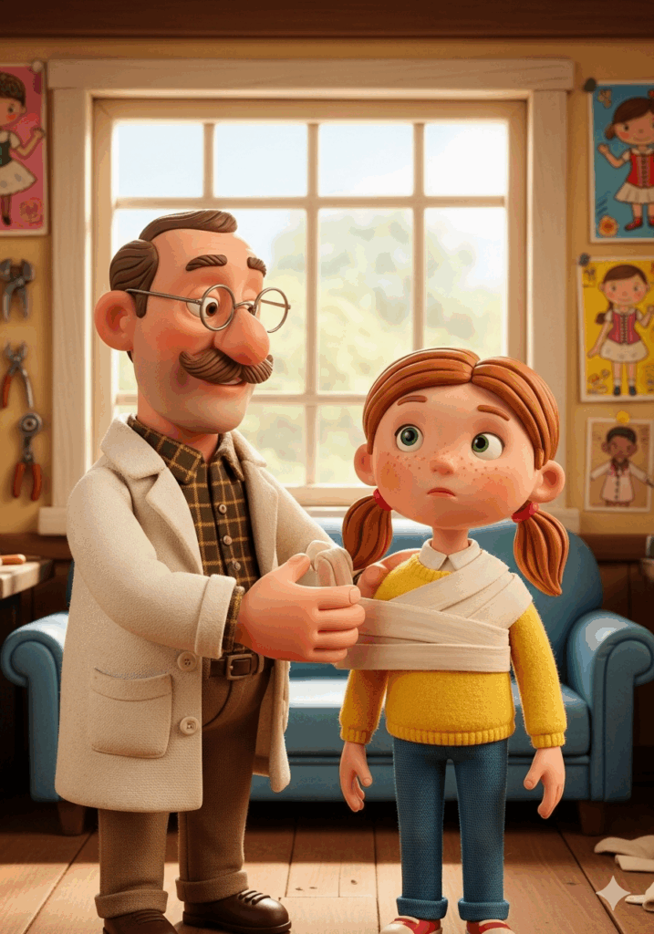 Der Arzt erklärte nach der Untersuchung: „Lina, dein Rücken braucht eine superstarke Umarmung, um gerade und kräftig zu wachsen. Du bekommst einen Superhelden-Panzer!“